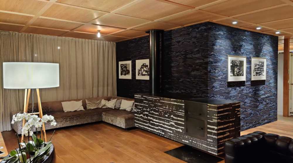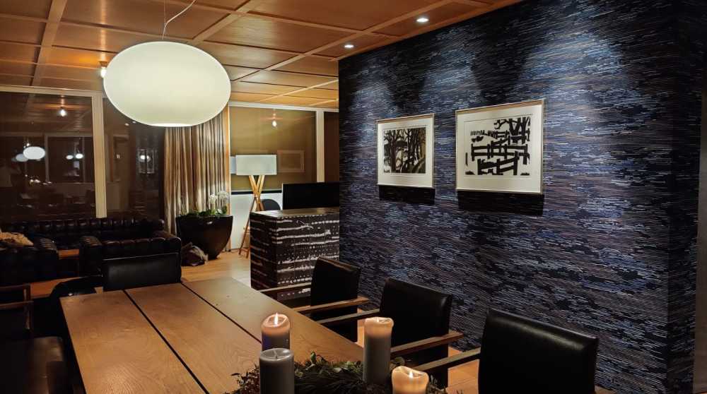 Mit dem farblichen Absetzen des Liftturmes, der sich durch das ganze Haus zieht, wird eine klare Strukturierung erreicht und ist eine logische, konsequente Weiterführung der Architektur. Sie unterstreicht im Unterbewusstsein die klare Formensprache und trägt zur Orientierung bei. Ein edler, dunkler Tapetenbelag aus Naturmaterialien, der an einen regionalen "Bändelteppich" erinnert und sich doch neutral im Hintergrund einreiht, wirkt heimelig. Das Hauptaugenmerk ist der Kachelofen aus handgemachten Rakutilefliesen, dessen Muster vergrößert von der dahinter applizierten Tapete übernommen wurde und sich trotz des dunklen Gesamteindrucks farblich hervorhebt.